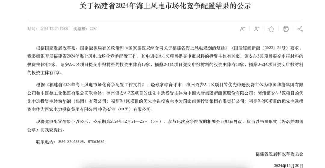 12月20日,福建省2024年海上风电市场化竞争配置结果公示。